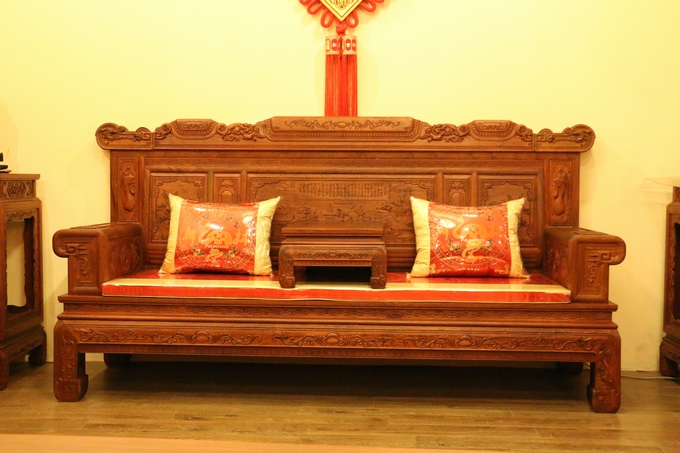 該款沙發(fā)整體之表現(xiàn)顯得極為嚴密厚實,無一處鏤空之雕飾,在最上端背板處的中間部分為留有一些花紋之邊幅加以修飾,顯得極為浮美雅觀。而在其左右兩側(cè)則另雕繪有“麒麟戲珠”與“雛鳥朝鳳”兩處紋飾圖案:“麒麟戲珠”紋飾設(shè)計地較為特別,如草龍紋一般,除頭部精細雕刻外,其余四肢與形體均簡略化,身體部位采用一銜邊條帶狀的紋飾相串于圓珠內(nèi),頗顯靈動神韻;而“雛鳥朝鳳”的圖案則是在背板最上部的左右兩端,末端是饒有一圓弧之設(shè)計為修飾收尾,顯得極為婉轉(zhuǎn)柔和圓潤。紋飾的圖案為一只可愛的雛鳥深情脈脈含情注視著前方鳥鳳的場景,顯得實為溫馨。鳳凰處之設(shè)計處理地也與前面麒麟一同:頭部細化,其余簡略帶過,鳳凰處眼眸之雕飾顯得極為醒目,神情表現(xiàn)形態(tài)逼真,層次感和手觸感亦十分明瀝彰顯,而經(jīng)燙蠟處理的表面緬花材質(zhì)表現(xiàn)地也更為細膩淡雅,極盡奢華。