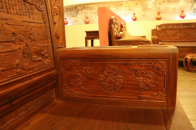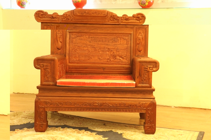 該篇文章共分三段落組成,除描繪了蘭亭的絕美景致以及王羲之一行人在集會時的所遇經(jīng)過外,也同時抒發(fā)了作者當時因為盛事無常而作出的“修短隨化,終期于盡”的人生感嘆。不過,細細品味之,就能從文章的字句中,深切地體會到王羲之那積極入世的人生觀,與那老莊無為學(xué)說所形成的鮮明對比。而今天,我們福林堂紅木要為大家介紹的這一款沙發(fā)——壯志凌云沙發(fā),就是為了表達這一初衷和愿望,以寄托鴻鵠之志,壯志凌云。該款沙發(fā)以明清古典家具傳統(tǒng)工藝為基礎(chǔ),采用燙蠟的裝飾工藝,更好的展現(xiàn)了其木材優(yōu)美的紋理。沙發(fā)的背板處除雕刻有王羲之《蘭亭序》的浮雕字體外,還配有山水、亭臺樓閣、以及各種象征福壽之寓意的如仙鶴、壽瓜、蝙蝠、鳥鳳等多種吉祥紋飾,整體的畫風(fēng)顯得氣勢磅礴,極好地彰顯了主人的宏偉志向與不凡的人生追求。